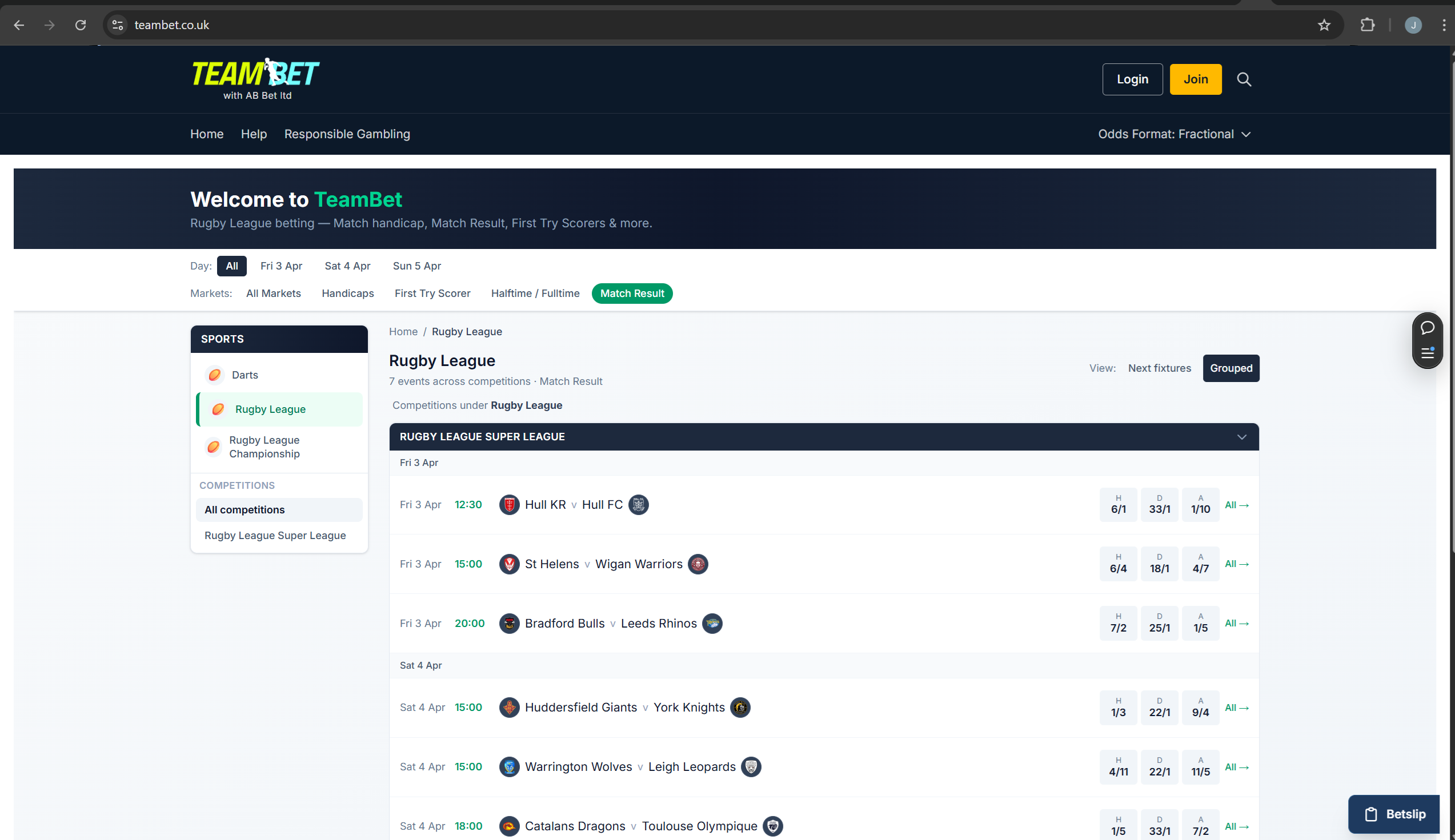 Sports & bettingRugby League betting focused on handicaps, match results, and try scorers — fast fixtures, grouped views, and a clear betslip. TeamBet is a Rugby League–first betting front end: match handicap, match result, first try scorers, and related markets, organised by day and competition so fans can scan fixtures quickly. The interface prioritises legibility under time pressure — fixture lists, handicaps, and the betslip stay distinct so users can build slips without losing context. Layout and hierarchy are tuned for mobile and desktop sessions alike, where odds and market names need to scan cleanly. This project is a good example of domain-specific UX: sports betting has strong conventions; the goal was to meet user expectations while keeping the experience fast, trustworthy, and easy to extend as more competitions and views are added.