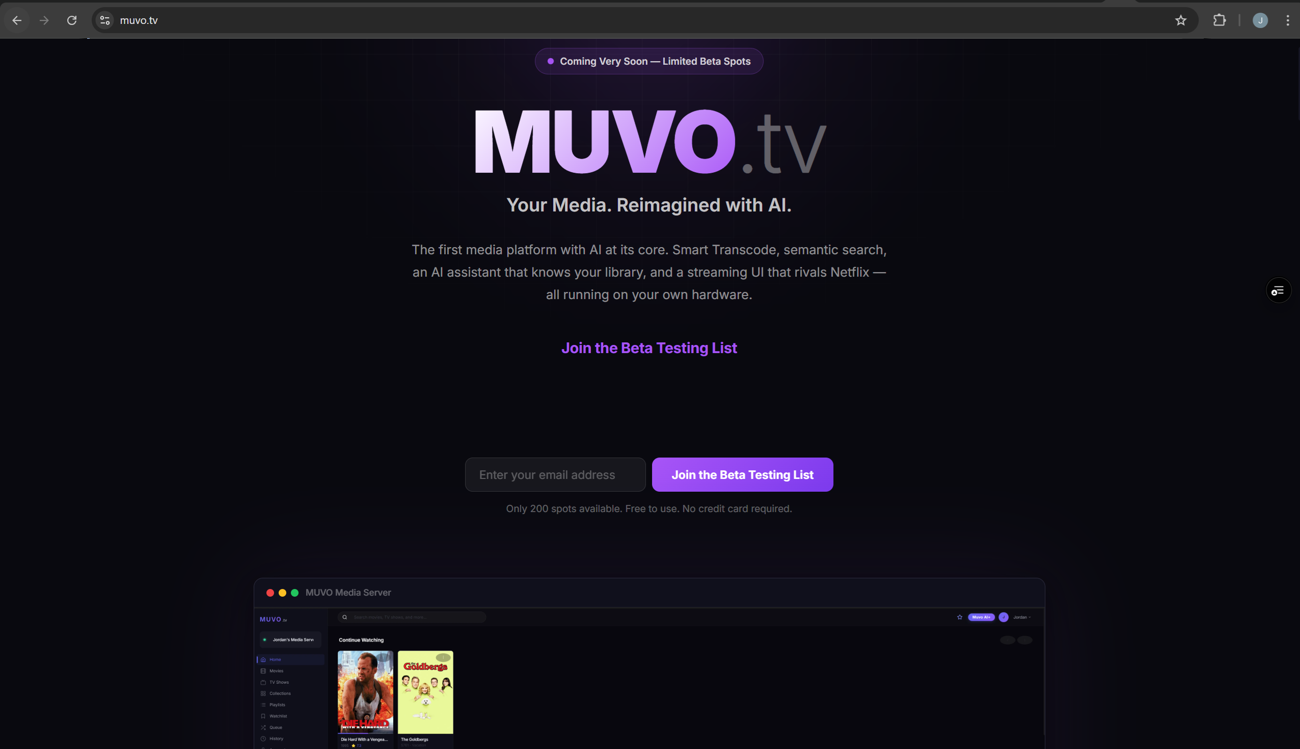 SaaS & mediaMarketing site for an AI-native self-hosted media platform — smart libraries, transcoding, and a cinematic UI on your own hardware. MUVO.tv is the public face of a next-generation self-hosted media stack: AI-assisted setup, intelligent transcoding that avoids unnecessary re-encoding, and a streaming experience pitched at the same bar as mainstream platforms — while your library stays on your hardware. We built a long-form marketing experience that walks visitors from beta signup through concrete product pillars: watch folders that organise and match metadata, semantic search and recommendations, server dashboards, and a transparent comparison with other media servers. The tone is technical but approachable — aimed at power users who care about privacy, extensibility (APIs, plugins, webhooks), and a modern React-based UI.